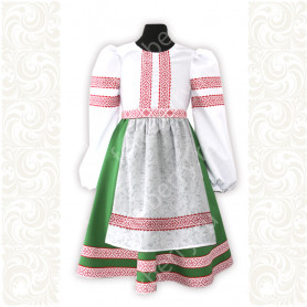 Костюм  выполнен из габардина и красиво подобранного декора в золотистых цветах. Достоинства габардина  в том, что он не мнется, не блестит, как атлас, ложится красивыми  мягкими складками, цвет не выгорает. Юбка  с оборкой, декор в золотистых цветах, по талии на  двойной резинке. Блуза  белого праздничного цвета, с баской,  рукава расширены внизу, с манжетами.   Сзади на блузе шнуровка. Она дает хорошую посадку по фигуре. Костюм предназначен для творческих  сольных и коллективных театральных выступлений.