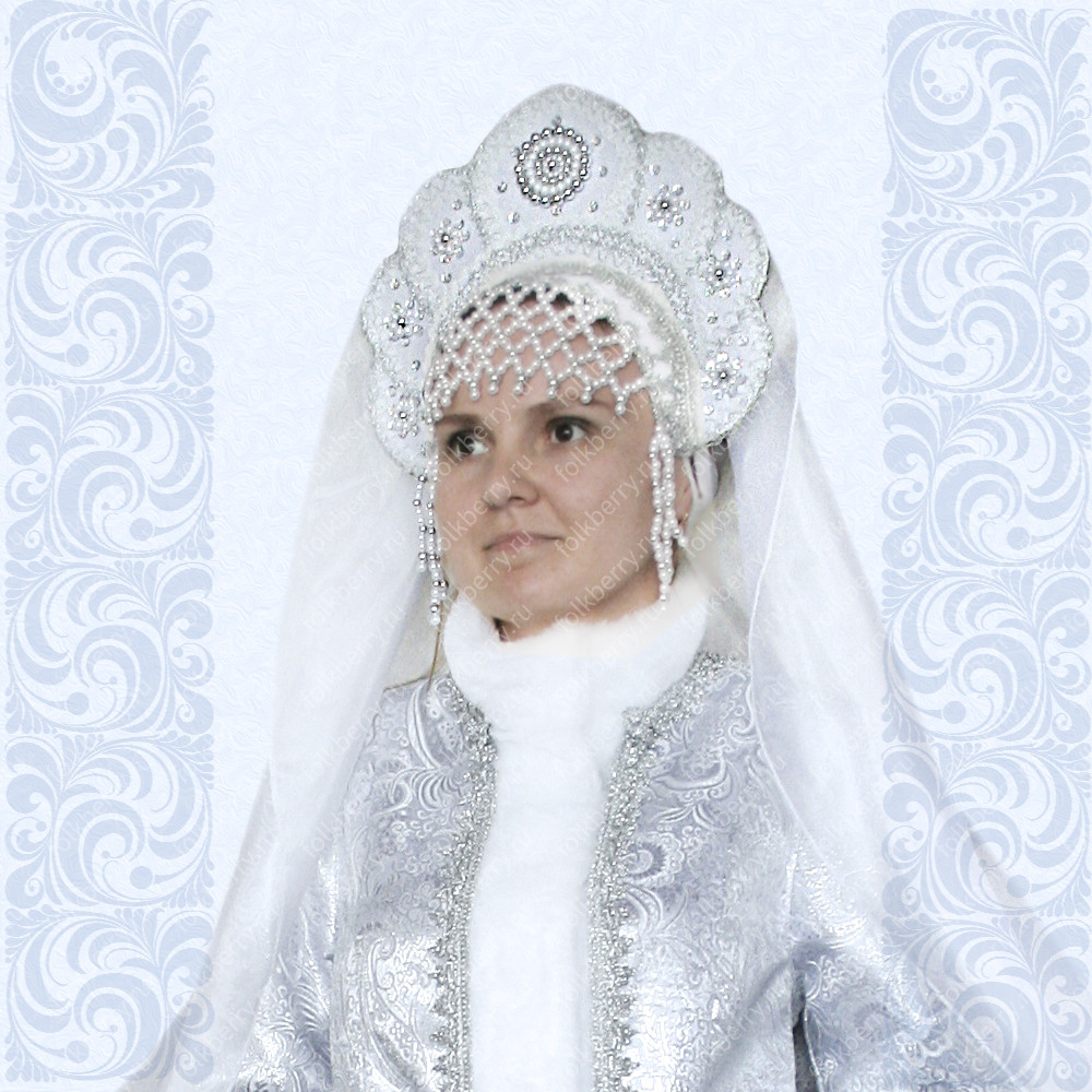 В состав костюма входит высокий кокошник ( четыре варианта на выбор). К кокошнику можно дозаказать фату из белой прозрачной органзы средней длины или длиннную (+300 или 600 руб).