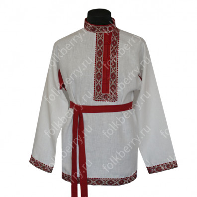 Косоворотка мужская "Православная" выполнена из небеленого льна и украшена народным геометрическим орнаментом в красных тонах. Планка, полики, пояс-кушак также выполнены из красного цвета.