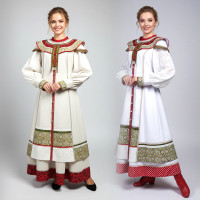 Костюм выполнен из парчи бело-серебристого цвета. Костюм декорирован искусственным мехом белого цвета. Застежка - потайные кнопки. Силуэт - приталенный, сзади кулиска для регулировки талии. Красивый пышный рукав. Отделка - серебристая ажурная тесьма. Длина шубки по спинке 93-98 см (от седьмого шейного позвонка до низа изделия).