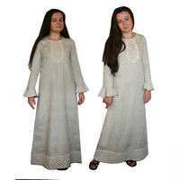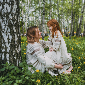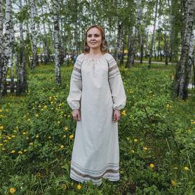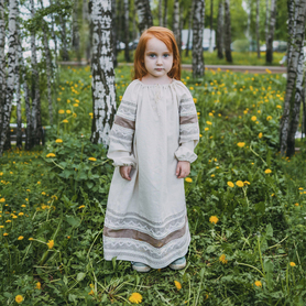 Платье «Дмитра» – отличный вариант наряда для тематических праздников  в детском саду и школе, православных и других мероприятиях. Платье  хорошо садится по фигуре и удобное в носке, благодаря регулируемой горловине, рукаву реглан, длинному поясу.  Юбка (почти солнце) длиной немного ниже колена эффектно смотрится при исполнении танца. Талия  немного завышена. Декор платья - жаккардовая тесьма с обережными символами. Платье шьется из габардина, из матовой, немнущейся ткани ярких цветов.