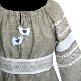 Платье сшито из яркого красного атласа и декорировано вставками с рисунком «хохлома». Юбка фасон полтора «солнца», подол и горловина украшены белым кружевом и тесьмой. Рукава «фонарики» сделаны из легкой, белой органзы.