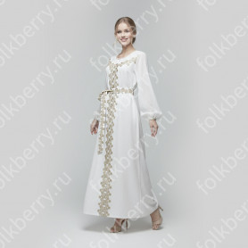 Эта традиционная женская рубаха ( длинная туника с поликами под мышками, с разрезами по бокам, с поясом) из белого льна декорирована по низу рукава, подолу и на груди широкой жаккардовой тесьмой со славянскими обережными символами красного цвета на белом фоне.