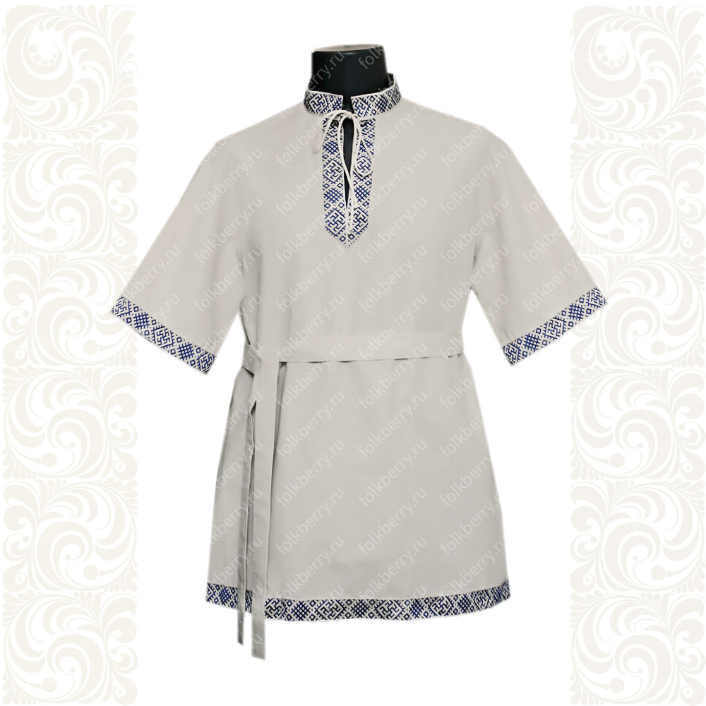 Мужская рубаха «Истоки» выполнена в свободном крое, подходящим любой фигуре. Сшита из льняной ткани. Модель имеет втачной, короткий рукав, ворот с завязками, с поясом (кушаком) из ткани с тесьмой. По низу, вороту, рукавам изделия декор из жаккардовой тесьмы со славянским рисунком- оберегом.