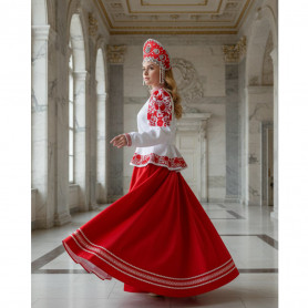 Выполненный в православном стиле сарафан с блузой «Русь» сшит из натурального хлопка в цветочек. Модель скромно декорирована однотонным воланом в цвет с основной тканью и тесьмой вьюнок. Можно носить под пояс и регулировать бретели по длине. Белая блузка из хлопка с длинным рукавом расшита натуральным нежным кружевом.