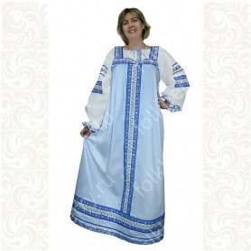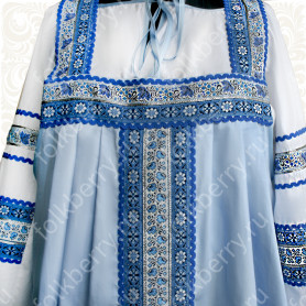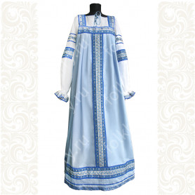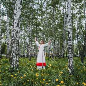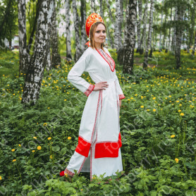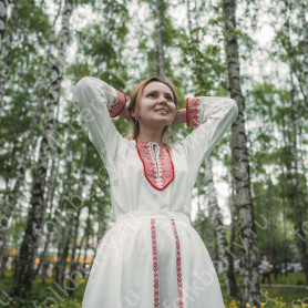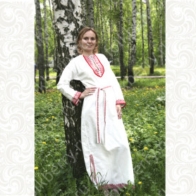 Сарафан с блузой «Глаша» выполнен из небеленного льна в традиционном славянском стиле. Модель отличается свободным кроем, украшена красной жаккардовой тесьмой с цветочным рисунком, золотистой тесьмой и «вьюнком». Бретели сарафана регулируются по длине. Комбинированная блуза из хлопка со вставками из льна с длинным рукавом украшена таким же, как и сарафан, орнаментом.