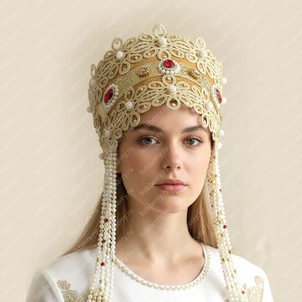 3. Кокошник выполнен из парчи, кружева, страз. К кокошнику прилагаются полупрозрачная фата и длинные бусы-подвески. Высота кокошника 13 см. Сзади ленты-крылья. Кокошник легкий и удобный.