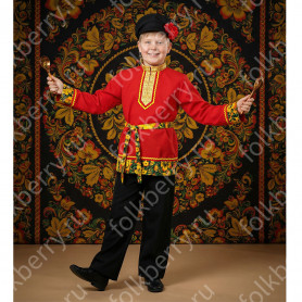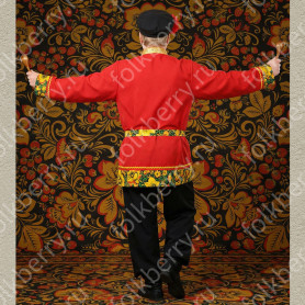 Костюм  выполнен из габардина и красиво подобранного декора в золотистых цветах. Достоинства габардина  в том, что он не мнется, не блестит, как атлас, ложится красивыми  мягкими складками, цвет не выгорает. Юбка  с оборкой, декор в золотистых цветах, по талии на  двойной резинке. Блуза  белого праздничного цвета, с баской,  рукава расширены внизу, с манжетами.   Сзади на блузе шнуровка. Она дает хорошую посадку по фигуре. Костюм предназначен для творческих  сольных и коллективных театральных выступлений.